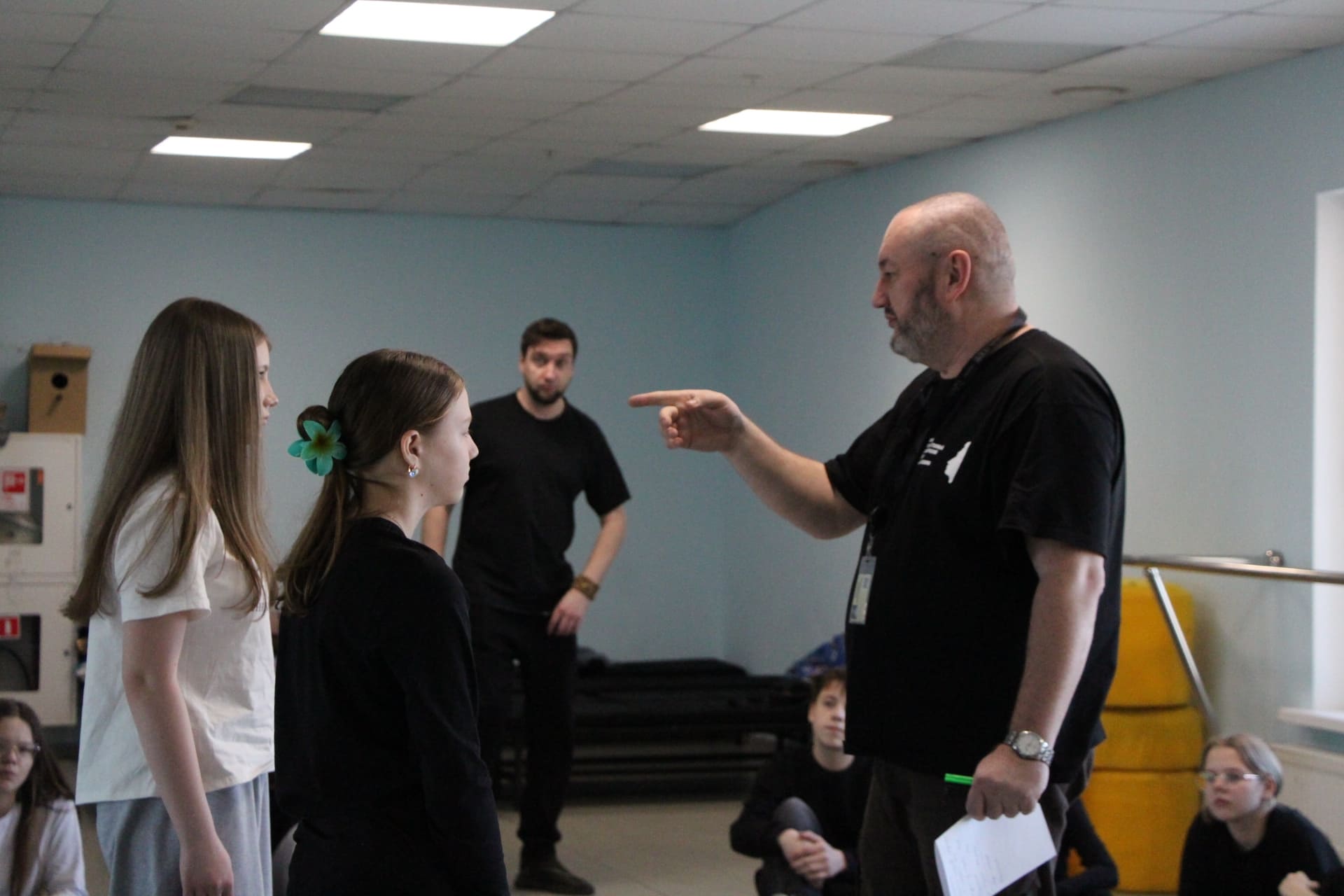 Денис Юрьевич поговорил с ребятами о том, каким должен быть профессиональный артист, и провел вместе с ними несколько упражнений на развитие внимания, памяти и воображения.