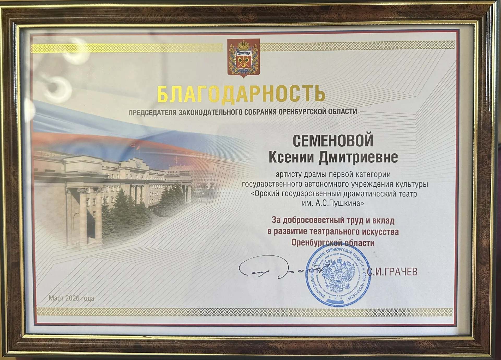 Благодарностью Председателя Законодательного Собрания Оренбургской области за роль Марии в спектакле "Один на один" и добросовестный труд и вклад в развитие театрального искусства Оренбургской области наградили актрису Орского драматического театра, Ксению Семёнову! Поздравляем!
